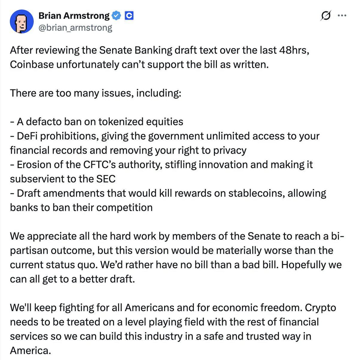 Читаю твит Brian Armstrong по поводу Clarity Act — и ловлю знакомое ощущение. Не восторг. Не паника. А холодное «что-то здесь не так». Когда крупнейшая криптокомпания США говорит: лучше никакого закона, чем плохой — это не поза. Это маркер. Запрет токенизированных акций. Давление на DeFi под предлогом «прозрачности». Размывание ролей регуляторов. Убийство конкуренции стейблкоинов в пользу банков. Если убрать детали, остаётся простая конструкция: мы не против инноваций — но только если они не мешают старой системе. И вот здесь начинается самое интересное. Регулирование — это всегда не про безопасность. Это про контроль точек входа. Про то, кто держит рычаги. И кто решает, что считается «разрешённой» инновацией. Крипта слишком рано поверила, что её будут регулировать как отрасль. Её пытаются оформить как угрозу. И когда даже Coinbase — максимально комплаентная, системная, «белая» — говорит «нет», это значит, что документ написан не для будущего. Он написан для сохранения прошлог