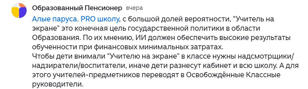 "Заменить учителей-предметников на ИИ, а оставшихся перевести в освобождённых клруков".