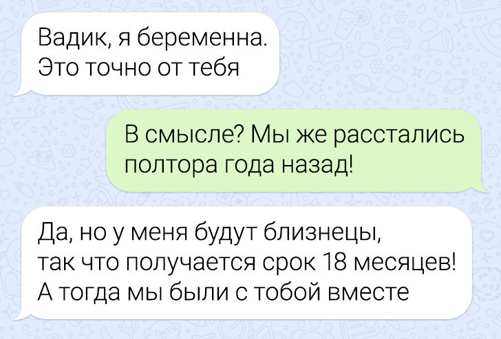 Сколько раз в день вы чатитесь в мессенджерах? Кажется, что немного, но на самом деле мы делаем это довольно часто: отвечаем на СМС по работе, спрашиваем, как дела у ребенка, уточняем детали интернет-заказов. И в этом огромном количестве сообщений наверняка найдутся такие, финал которых слегка ошарашивает. Рекомендуем также заглянуть сюда 👇👇👇 Спасибо, что дочитали до конца!
