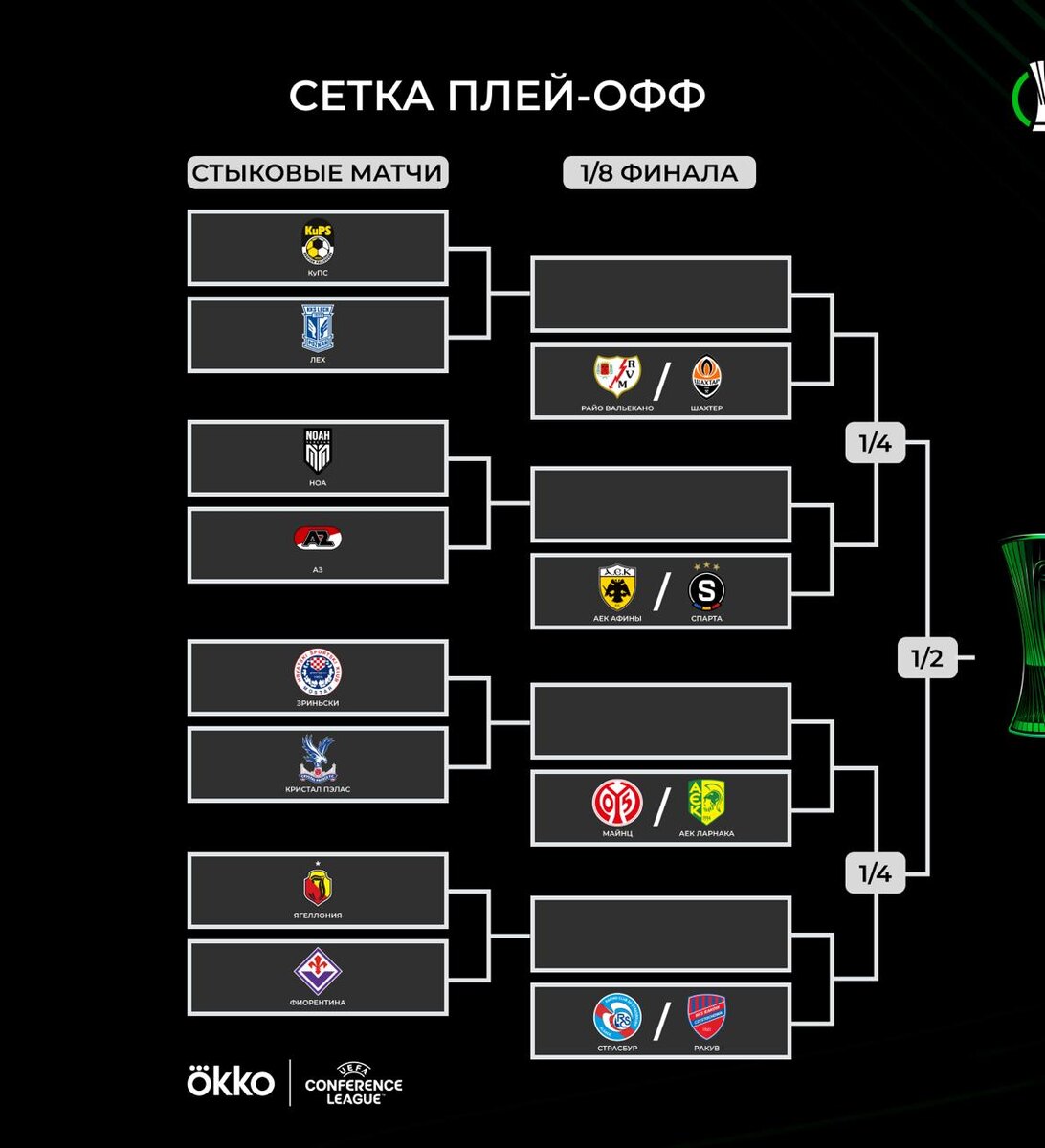 Такие получились пары: 🇫🇮 КуПС — «Лех» 🇵🇱 🇦🇲 «Ноа» — «АЗ» 🇳🇱 🇧🇦 «Зриньски» — «Кристал Пэлас» 🏴 🇵🇱 «Ягеллония» — «Фиорентина» 🇮🇹 🇲🇰 «Шкендия» — «Самсунспор» 🇹🇷 🇽🇰 «Дрита» — «Целе» 🇸🇮 🇨🇿 «Сигма» — «Лозанна»🇨🇭 🇨🇾 «Омония» — «Риека» 🇭🇷 Матчи пройдут 19 и 26 февраля. Ждем 🏆 😃 Смотри Okko прямо сейчас!