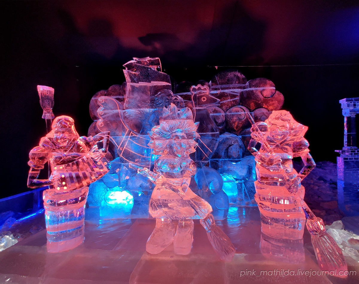 Не всё понравилось, вот, например, композицию на входе запечатлела только ради львов. Тут плоховато видно, но везде зайцы и очень мило. Внезапно Колобок :-) Вообще я фоткалась на фоне Водяного, но как-то его неприлично размазало, простите. Видимо, какая-то странная Золушка. Вообще, если она вышла из яйца, означает ли это, что она дочь Кащея? :-) Каменный-не каменный, но как минимум ледяной цветок у Данилы-мастера вышел :-) На многих работах были классные детали. Вот тут и лошади и квадрига на арке Главного штаба дивные. А дедушка уже как-то идёт лесом. А дальше одна из лучших, на мой взгляд, компози