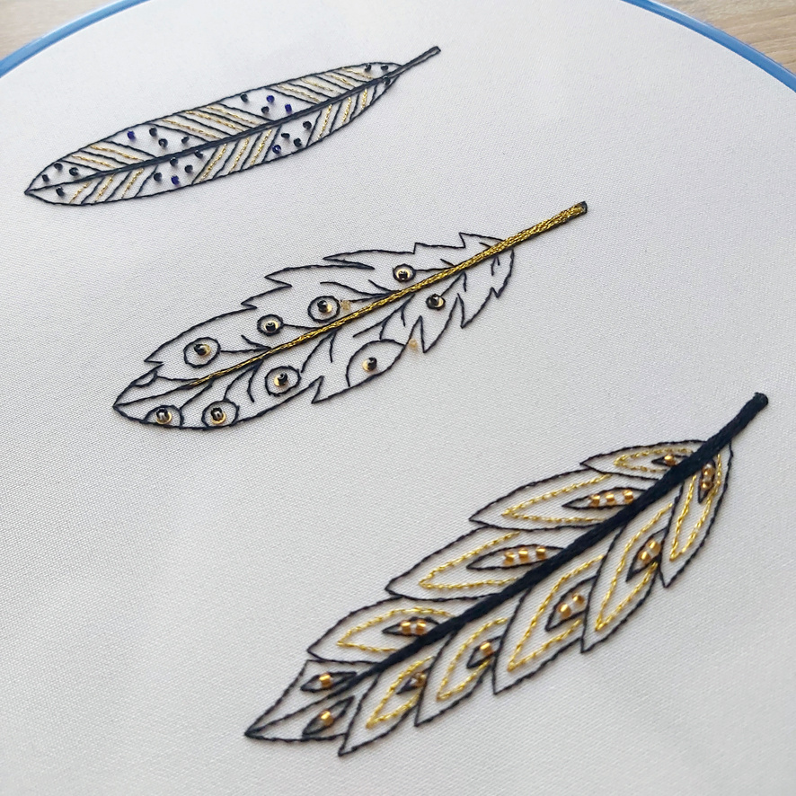 Давайте продолжим тему пернатых, начатую журналом Inspiratons, и попробуем вышить хотя бы одно из этих трех перышек.