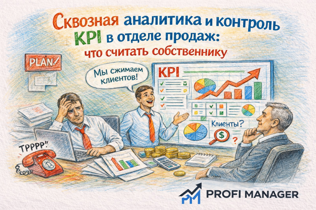 Собственники бизнеса часто сталкиваются с одной и той же проблемой: продажи вроде есть, CRM заполнена, отчёты формируются, но понимания — нет. Где теряются деньги? Какие показатели реально влияют на выручку? Кто работает эффективно, а кто просто «создаёт видимость»? В этой статье разберём, как выстроить сквозную аналитику и контроль KPI отдела продаж, какие показатели продаж важно считать именно собственнику и как превратить аналитику продаж в управляемый инструмент роста прибыли. Сквозная аналитика продаж — это не отчёт «ради галочки». Для собственника она решает три ключевые задачи: Без системной аналитики контроль показателей продаж превращается в хаотичную проверку планов и звонков, которая не даёт роста. Сквозная аналитика — это система, которая соединяет: Главный принцип: каждый рубль выручки должен быть привязан к источнику и действиям отдела продаж. Пример цепочки: Реклама → заявка → звонок → сделка → оплата → прибыль Если на любом этапе нет данных — аналитика «рвётся», и собс