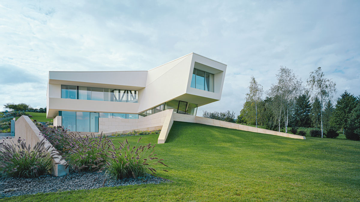 Монолитный жилой дом построен недалеко от Вены, на открытом участке на склоне холма. Скульптурный объект окружен садом, мягко переходящим в близлежащие поля. Основная часть здания состоит из двух смещенных объемов, идущих по склону с севера и юга. Цокольный уровень, на котором расположены гараж и складские помещения, встроен в ландшафт, и его видимые внешние стены покрыты португальским известняком. Вилла напоминает космический корабль, белый как снаружи, так и внутри. Однородная палитра подчеркнута четкими линиями, придающими строению ультрасовременный характер. Из-за своей прозрачности конструкция лестницы кажется плывущей и легкой, она не блокирует свет, а растворяется в открытом пространстве. Просторная гостиная-кухня с отдельной рабочей зоной поражает своей чистотой и функциональностью. Форма и материал «острова» превращают его в скульптуру, сразу привлекающую внимание. Ни один, даже такой нетрадиционный дом, как этот, не обходится без камина. Он встроен в бетонный блок в центре от