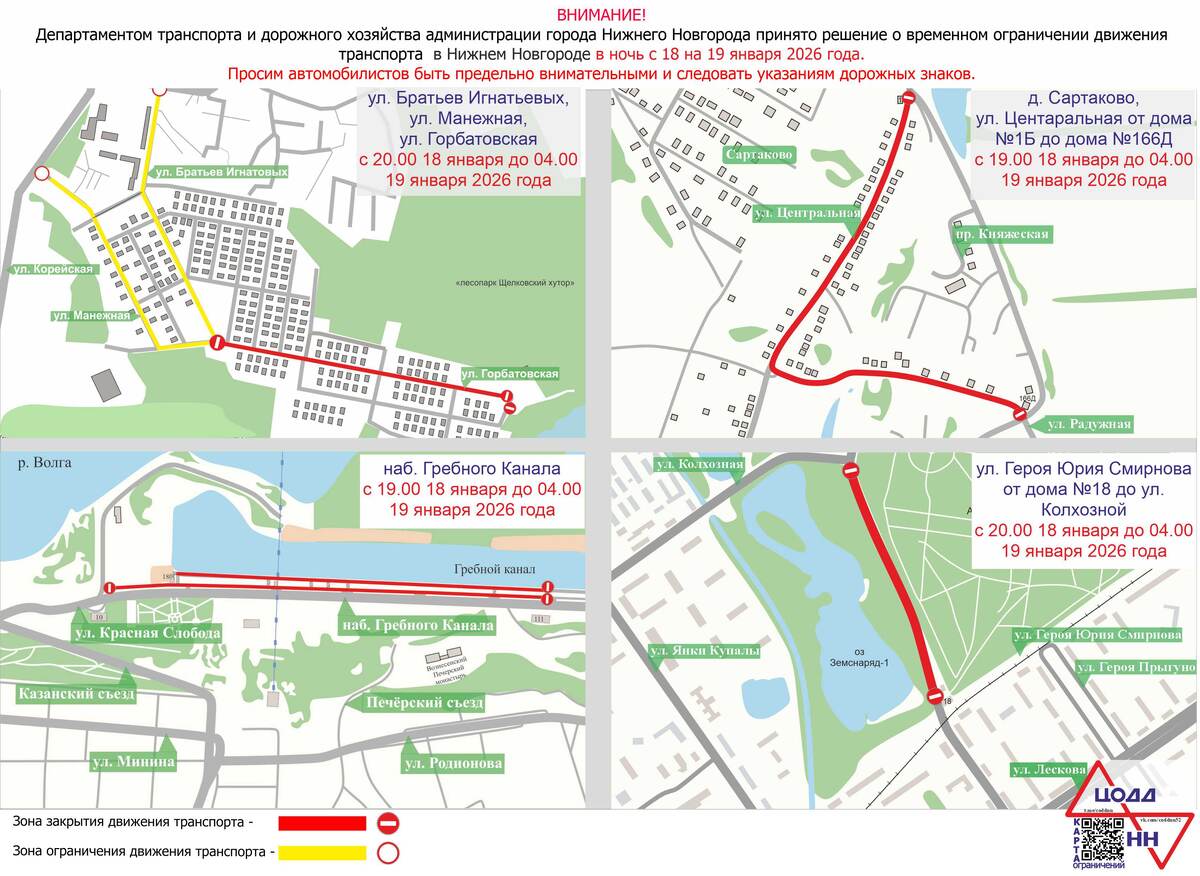 Нижегородцев ждут транспортные ограничения в ночь на 19 января, сообщили в городском дептрансе. Так, с 20:00 18 января до 04:00 19 января будет перекрыт проезд от дома №18 на улице Героя Смирнова до Колхозной, а также на улицах Братьев Игнатовых, Манежной и Горбатовской. Кроме того, закроют проезд на набережной Гребного канала — с 19:00 18 января до 04:00 19 января и в деревне Сартаково от дома №1 Б до дома №166 Д на Центральной улице. Водителей просят быть внимательнее и следовать указаниям дорожных знаков. Напомним, 19 января православные отмечают Крещение Господне. По этому поводу проходят крещенские купания. В 2026 году в Нижегородской области оборудуют 66 купелей, из них семь — в областном центре. Специалисты подчеркивают, что окунаться в прорубь можно не всем. Существует ряд противопоказаний. Подробности тут.