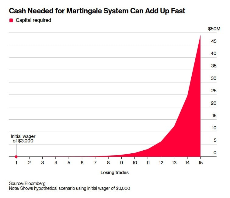 Среди завсегдатаев казино иногда находятся те, кто придумал, «как обмануть систему». Смотрите: надо просто ставить сто баксов в рулетке на красное. Дальше ты либо выигрываешь и получаешь халявные +$100, либо проигрываешь – и в этом случае надо просто следом ставить на красное уже $200, чтобы в случае выигрыша и отыграть предыдущую потерю, и получить халявные +$100. Если проиграешь и во второй раз – не беда, надо просто поставить на красное $400… В общем, вы поняли идею. У лудоманов этот подход именуется «Мартингейл», а на бирже класс стратегий с похожим профилем риска принято называть «собирать монетки перед паровым катком». Потому что со стороны, если не вдаваться в детали, стратегия долгое время может казаться «надежным способом генерировать стабильную доходность по сто долларов без каких-либо рисков». А потом неизбежно наступает момент, когда ты проиграл слишком много раз подряд – и в очередной раз удвоить ставку уже тупо не хватает капитала. Ну и тут тогда конец – паровой каток до