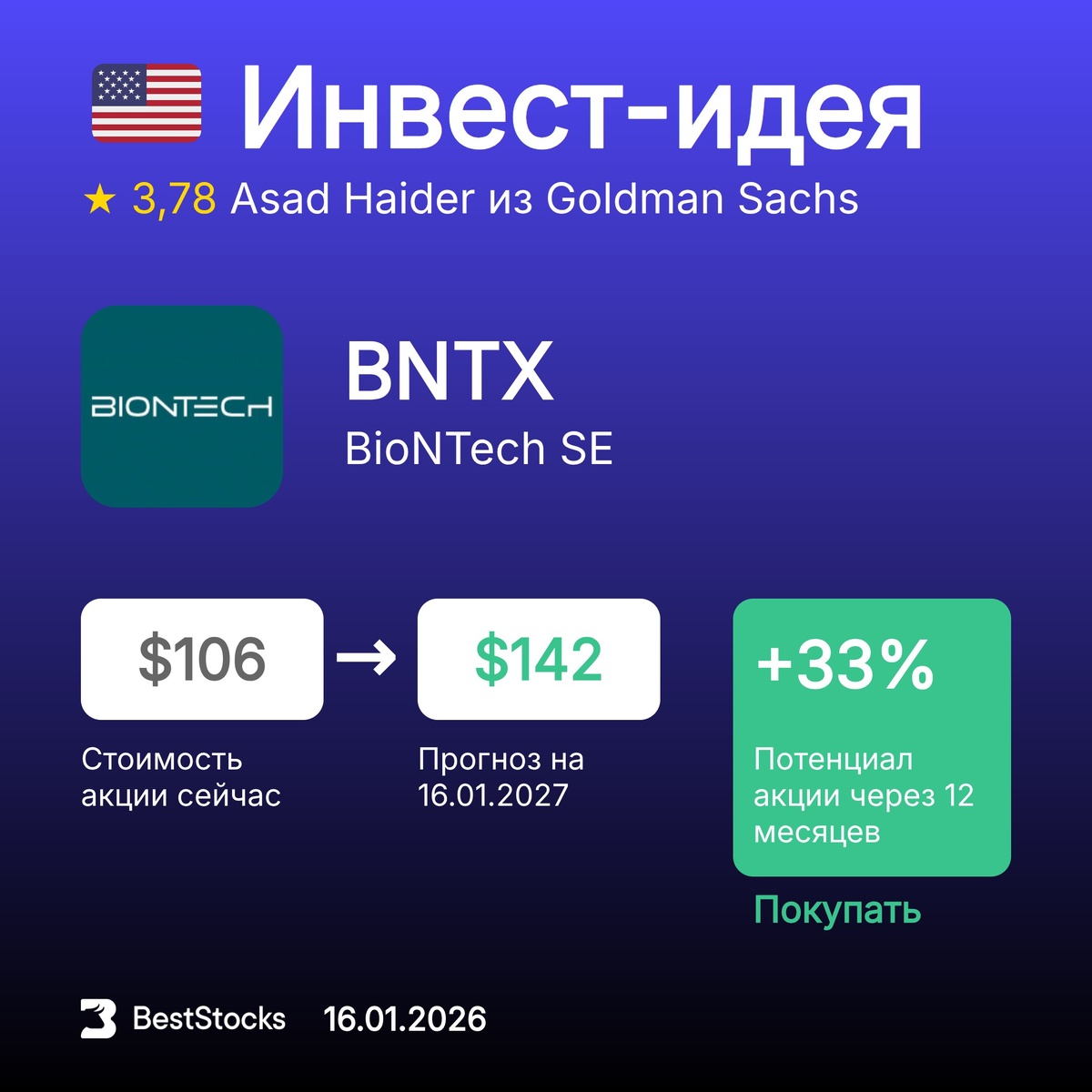 Π’ΠΈΠΊΠ΅Ρ: BNTX ΠΡΠΎΠ³Π½ΠΎΠ·Π½Π°Ρ ΡΠ΅Π½Π°: $142 (+33%) Π Π΅ΠΊΠΎΠΌΠ΅Π½Π΄Π°ΡΠΈΡ: ΠΠΎΠΊΡΠΏΠ°ΡΡ InvestRank Π°ΠΊΡΠΈΠΈ: 8 ΠΈΠ· 10 ΠΡΠΎΠ³Π½ΠΎΠ· ΡΠ΄Π΅Π»Π°Π½: 16.01.2026 ΠΡΠΎΠ³Π½ΠΎΠ· Π΄ΠΎ: 16.01.2027 ΠΠ½Π²Π΅ΡΡ-ΠΊΠΎΠΌΠΏΠ°Π½ΠΈΡ: Goldman Sachs ΠΠ½Π°Π»ΠΈΡΠΈΠΊ: Asad Haider ΠΡΡ ΡΠ΅ΠΊΠΎΠΌΠ΅Π½Π΄Π°ΡΠΈΠΈ Π½Π° ΡΠ΅Π³ΠΎΠ΄Π½Ρ β β’β’β’β’β’ β‘οΈ ΠΠΎΠ²ΡΠΉ ΡΡΠ½ΠΊΡΠΈΠΎΠ½Π°Π» Π½Π° ΡΠ°ΠΉΡΠ΅ β π·πΊ ΠΠ°ΠΊΠΈΠ΅ ΡΡΡΡΠΊΠΈΠ΅ Π°ΠΊΡΠΈΠΈ Π² ΡΡΠ΅Π½Π΄Π΅. Π£Π·Π½Π°ΠΉΡΠ΅, ΠΊΠ°ΠΊΠΈΠ΅ Π±ΡΠΌΠ°Π³ΠΈ ΠΈΠ· Π ΠΎΡΡΠΈΠΈ ΠΏΠΎΠ»ΡΡΠΈΠ»ΠΈ Π±ΠΎΠ»ΡΡΠ΅ Π²ΡΠ΅Π³ΠΎ ΡΠ΅ΠΊΠΎΠΌΠ΅Π½Π΄Π°ΡΠΈΠΉ Π·Π° ΠΏΠΎΡΠ»Π΅Π΄Π½ΡΡ Π½Π΅Π΄Π΅Π»Ρ.