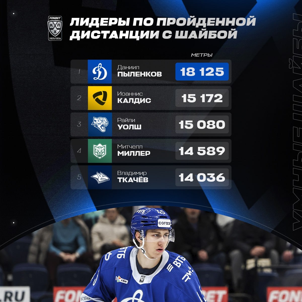 🔵 Даниил Пыленков является безоговорочным лидером сезона по дистанции с шайбой: его преимущество перед вторым местом составляет почти три