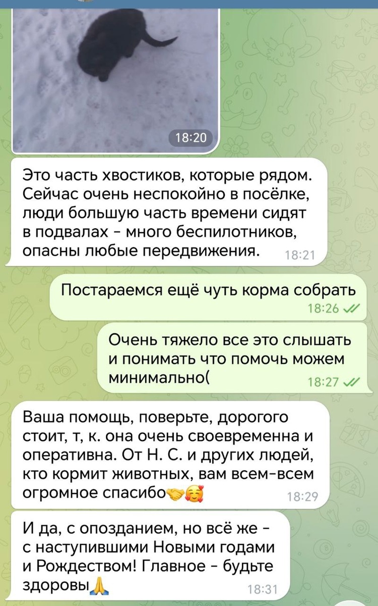! Два адресата из Глушково- люди которые несмотря на трудности и риски продолжают заботиться об оставшихся животных получили наши с вами посылки с кормом. 🧸🎁 Мы на всякий случай не раскрываем личные данные, но не можем удержаться от выражения искренней благодарности от имени всей нашей команды и самих обитателей Глушково. 🩷 Пусть ваше сердце наполняется радостью и гордостью за совершенные поступки, а жизнь приносит ещё больше поводов для улыбок и счастья. Ваш вклад невероятно важен, и мы уверены, что благодаря вашей помощи многие животные обретут шанс на будущее.🌟 От всей души желаем каждому участнику крепкого здоровья, вдохновения и веры в добро! Вместе мы способны творить чудеса и дарить тепло нуждающимся. Большое спасибо вам за всё, что вы делаете!🫶