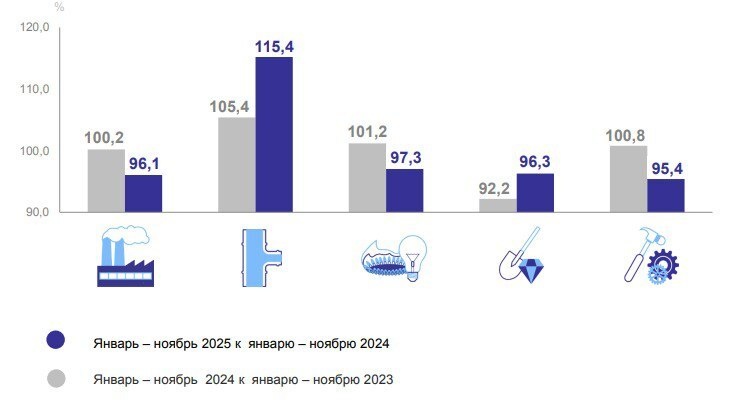 Индекс промышленного производства за январь-ноябрь 2025 г. показал снижение на 3,9% по сравнению с аналогичным периодом 2024 г., составив 96,1%. Для сравнения: годом ранее рост по отношению к январю–ноябрю 2023-го был зафиксирован на уровне 100,2%. Резкое увеличение показателей отмечено в сфере «Водоснабжение; водоотведение, организация сбора и утилизации отходов, деятельность по ликвидации загрязнений» — объем производства вырос на 15,4%. В то же время снизились показатели «Обрабатывающих производств» (-4,6%), «Добычи полезных ископаемых» (-3,7%) и «Обеспечения электрической энергией, газом и паром; кондиционирования воздуха» (-2,7%). Цены для потребителей продолжают расти. В ноябре 2025 г. по сравнению с декабрем 2024-го товары и услуги подорожали на 4,9%. В производственном секторе тарифы на грузовые перевозки увеличились на 1,7%, а цены производителей промышленных товаров и сельхозпродукции, напротив, снизились на 3,3% и 2,4% соответственно. При этом цены на услуги за этот период у
