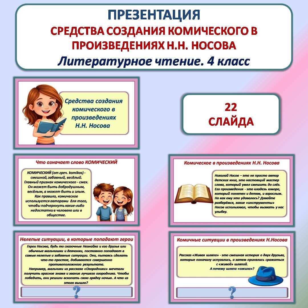Презентация «Средства создания комического в произведениях Н.Н. Носова» разработана к уроку литературного чтения в 4 классе. Презентация состоит из 22 слайдов. Слайды № 6, 9,10, 14,15,16, 17 анимированы, чтобы у учителя была возможность организовать беседу с учащимися. По щелчку появляются ответы. Задачи, которые поможет решить презентация: Материал изложен простым и понятным языком, с учетом возрастных особенностей учащихся. Содержание презентации можно отредактировать по желанию и подстроить под цели вашего урока. Презентацию скачать здесь Рабочий лист скачать здесь Желаю успеха!
