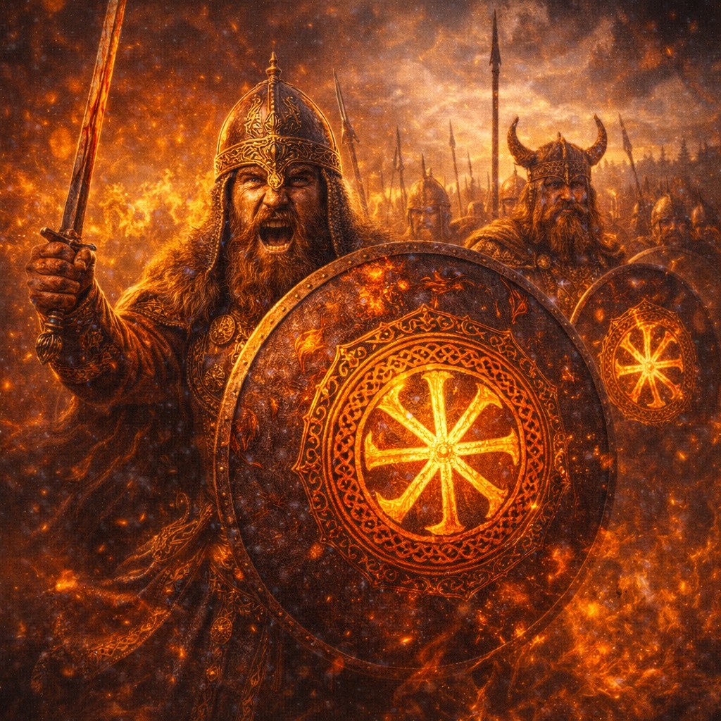 Есть символы, которые никогда не предназначались для тишины. Коловрат — один из них. Его не прятали под одеждой, не носили тайно и не держали «для красоты». Когда коловрат появлялся на щите воина, это означало только одно: человек выходил навстречу хаосу и заявлял о своём месте в порядке мира.