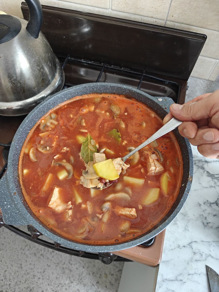! 🍲🌿 Быстрый и сбалансированный суп по Гарвардской тарелке: овощи (лук, томатная паста), белки (индейка, курица, фасоль, грибы), углеводы (картофель). Идеально для похудения без голода — энергия, сытость и вкус! Этот суп отлично закрывает потребность в белке и клетчатке. Ингредиенты (на 4 порции): - 250г грудки индейки (кубиками) - 200г куриной грудки (кубиками) - 400г фасоли - 400 гр шампиньонов - 200г картофеля (кубиками) - 2 луковицы (полукольцами) - два средних морковки - 2 ст.л. томатной пасты - 1 ч.л. паприки - 1 л бульона/воды - 1 ст.л. масла, соль/перец Приготовление (лучше всего в казане или воке): 1. Обжарь лук в масле 3 мин до золотистого цвета, добавь морковь кольцами, ещё 3 минуты, затем пасту и паприку -3-5 мин. 2. Добавь мясо, туши 5 мин. 3. Затем порезанные грибы и ещё немного обжарь. 4. Залей бульоном, всыпь картофель и фасоль (фаслоль на ночь замочить, потом варить отдельно 20-30 минут, воду слить). 5. Вари 20 мин. 6. Можно чуть подкислить уксусом, лимоном