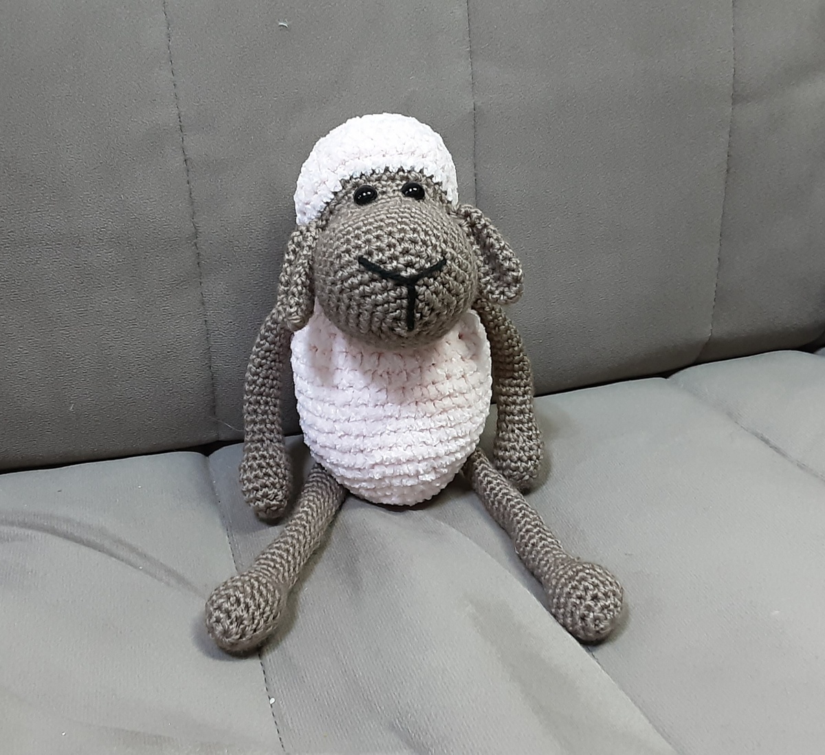 Дорогие друзья! Сегодня предлагаю связать вам ещё одну овечку. Вам понадобится пряжа Himalaya Hamigurumi, и пряжа YarnArt Velour. Наполнитель (синтепух). Лайфхак - синтепух 300 грамм стоит в магазинах 500 рублей. А я покупаю на ВБ подушку 40×40 см, в ней те же 300 грамм синтепуха, но стоит она всего150 рублей. Глазки 8 мм на безопасном креплении, контрастная нить(обозначить начало ряда), счётчик рядов крючок 3,5 мм и крючок 4 мм. Игла с широким ушком, для пришивания головы и вышивания носика. Мордочку, ушки, ножки и ручки вяжем пряжей Himalaya Hamigurumi крючком 3,5 мм по мастер-классу "ОВЕЧКА МИЛАША", ТУЛОВИЩЕ - пряжа YarnArt Velour, крючок 4,0 мм НАБИРАЕМ 6 петель в КА 6 приб, - 12 п 1сбн.приб × 6 раз - 18 п 2сбн.приб × 6 раз - 24 п 24п ввязываем ножки 3сбн.приб × 6 раз - 30п 4сбн.приб × 6 раз - 36 п 36п - 6 рядов 4сбн,уб × 6 раз - 30п 3сбн,уб × 6 раз - 24 п 2сбн,уб × 6 раз - 18 п 1сбн,уб × 6 раз - 12п 12п, ввязываем ручки 12п Набиваем туловище наполнителем 6уб - 6 п. Сшиваем 6п, нит
