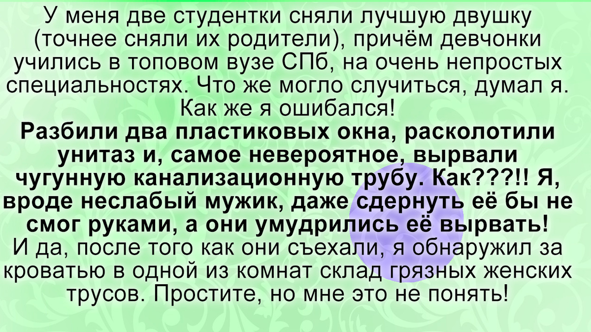 У меня две студентки сняли лучшую двушку (точнее сняли их родители), причём девчонки учились в топовом вузе СПб, на очень непростых специальностях. Что же могло случиться думал я. Как же я ошибался?