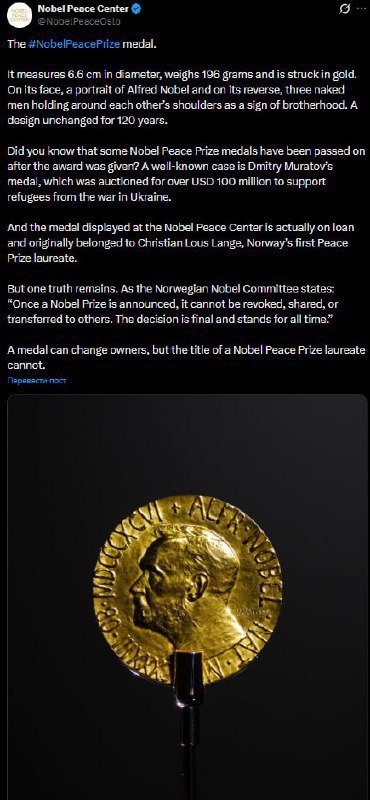 тут же заявили: это фейк. ▪️ Там пояснили: «Медаль может сменить владельца, но звание лауреата Нобелевской премии мира – нет». Проще говоря, Мачадо может передать Трампу медаль, но это не сделает его настоящим лауреатом. А предательницу Мачадо не сделает президентом Венесуэлы. Подписывайся