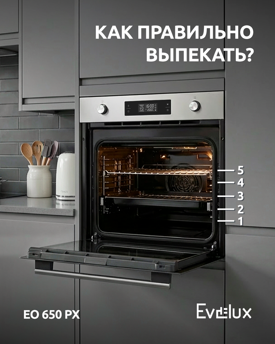 Знали ли вы, что в разных зонах духового шкафа тепло распределяется по-разному? В моделях Evelux уровни приготовления обозначены цифрами от 1 до 5 — снизу вверх. 🔸 Уровень 1 — медленное томление и запекание крупных кусков мяса, например жаркого или гуся. 🔸 Уровень 2 — выпечка пирогов, хлеба и булочек с равномерным пропеканием снизу и образованием хрустящей корочки. 🔸 Уровень 3 — запекание курицы целиком, филе рыбы и овощей с равномерным нагревом со всех сторон. 🔸 Уровень 4 — приготовление блюд с румяной корочкой, например запеканок и блюд под сыром. 🔸 Уровень 5 — быстрое подрумянивание, использование гриля и блюда, которым требуется интенсивное верхнее тепло. Подробнее о духовом шкафе Evelux EO 650 PX — по ссылке: https://clck.ru/3RJNwa