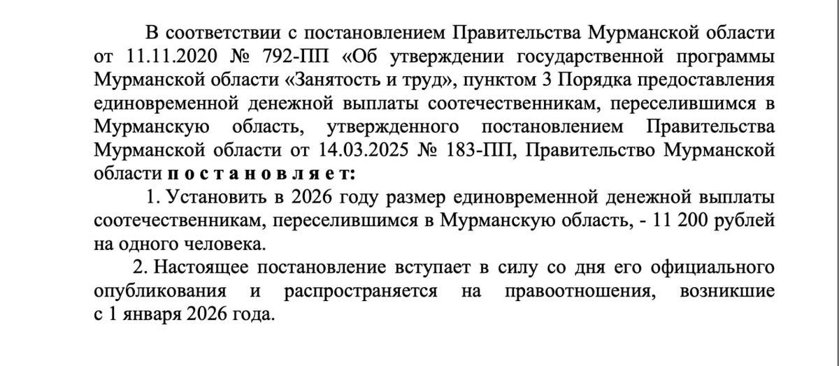 Размер единовременной денежной выплаты соотечественникам, переселившимся в Мурманскую область, с 1 января 2026 года составит 11,2 тыс