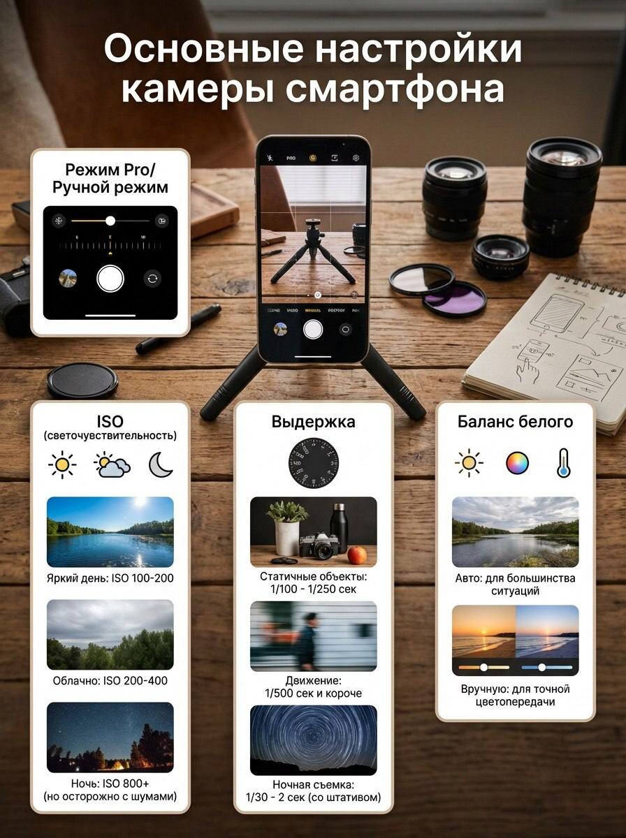 Представьте: в ваших руках — не просто гаджет, а ключ к параллельной реальности. Каждый кадр — это мгновение, вырванное из потока времени. Каждый снимок — история, которую вы рассказываете без слов. И всё это — в устройстве, которое вы носите в кармане. В мире фотографии свет — это жизнь. Он может превратить обыденное в шедевр или разрушить самую продуманную композицию. Ваш смартфон знает это и готов помочь — если вы научитесь с ним разговаривать. В режиме Pro вы получаете власть над тремя стихиями: · ISO — ваш регулятор яркости. В солнечный день держите его на минимуме: 100−200. В пасмурную погоду поднимите до 200−400. Ночью играйте осторожно: значения выше 800 могут превратить кадр в зернистую мозаику. · Выдержка — это время, за которое рождается изображение. Для застывших сцен достаточно 1/100−1/250 сек. Хотите поймать движение? Сократите до 1/500 сек и меньше. А ночью, вооружившись штативом, откройте затвор на 1−2 сек — и пусть тьма отступит перед вашим искусством. · Баланс белого