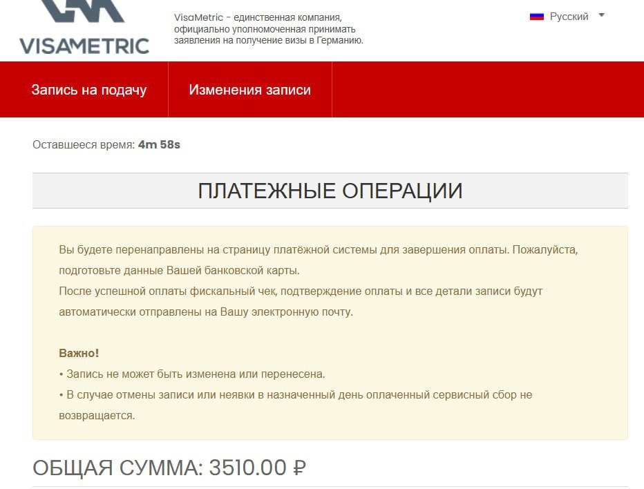 🔔 VisaMetric напомнил о важных условиях записи и оплаты