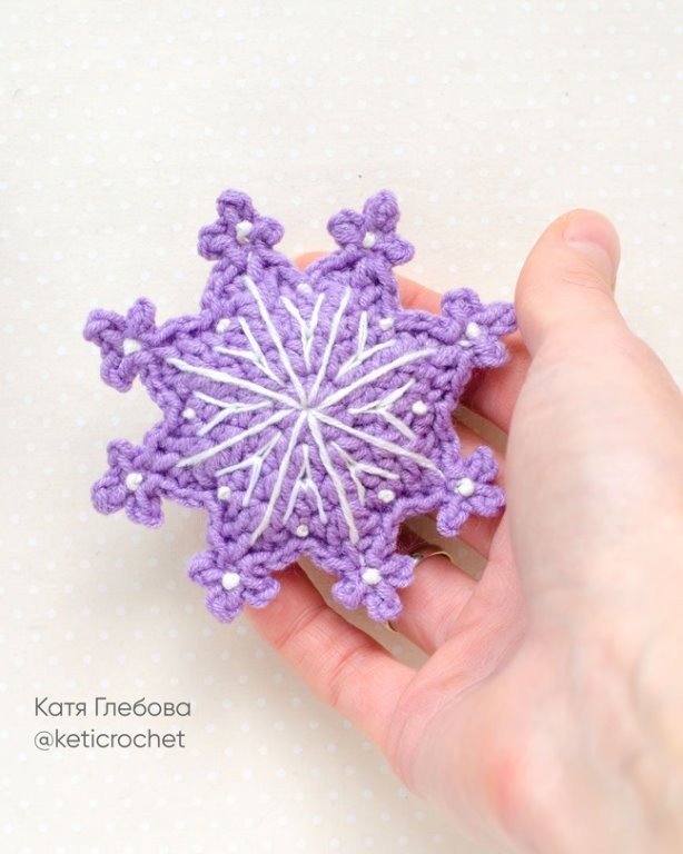 Куда девать остатки пряжи? Попробуйте связать маленькие плоские игрушки. Вязаные снежинки можно украсить на свое усмотрение. Я сделала вышивку белой ниткой, можно пришить бисер. Пряжа и крючок под толщину пряжи