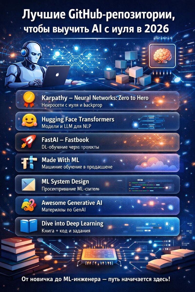 Если хочешь разобраться в ИИ не по курсам “в вакууме”, а через реальные open-source проекты - вот топ реп, которые реально ведут от базы до практики: 1) Karpathy – Neural Networks: Zero to Hero Самый понятный вход в нейросети и backprop “на пальцах” https://github.com/karpathy/nn-zero-to-hero 2) Hugging Face Transformers Главная библиотека современного NLP/LLM: модели, токенизаторы, fine-tuning https://github.com/huggingface/transformers 3) FastAI – Fastbook Практическое DL-обучение через проекты и эксперименты https://github.com/fastai/fastbook 4) Made With ML ML как инженерная система: пайплайны, прод, деплой, мониторинг https://github.com/GokuMohandas/Made-With-ML 5) Machine Learning System Design (Chip Huyen) Как строить ML-системы в реальном бизнесе: данные, метрики, инфраструктура https://github.com/chiphuyen/machine-learning-systems-design 6) Awesome Generative AI Guide Подборка материалов по GenAI: от основ до практики https://github.com/aishwaryanr/awesome-generative-ai-