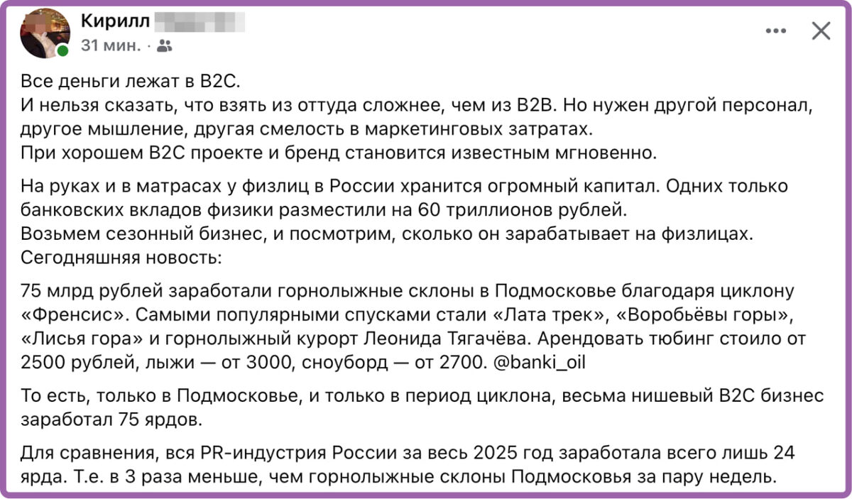 Вы читали, сколько заработали горнолыжные курорты Москвы? 75 млрд. Наверное, это как все ИТ вместе взятое :) (речь про месяц, каникулы). Почитайте мнение на картинке. Так ведь и есть. А вот как эти деньги получить в бизнес - хз. У меня ответа нет, ибо мы работаем в сегменте b2b и тут есть проблемки :) Русский ИТ бизнес