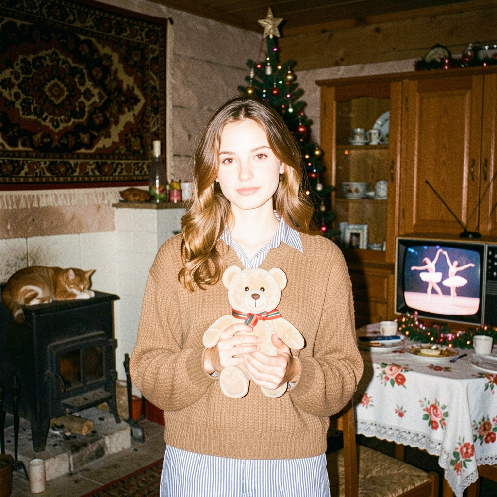 Аутентичный ретро-кадр в духе 90-х. Девушка в шерстяном свитере и полосатой рубашке держит советскую игрушку (мишку). Фоном служит интерьер деревенского дома: русская печь с дремлющим котом, ковёр на стене, советская новогодняя ёлка, сервант и старый ТВ с балетом и праздничным столом. Жёсткая вспышка, плёночная зернистость и мягкое размытие создают атмосферу снимка из семейного альбома середины девяностых.