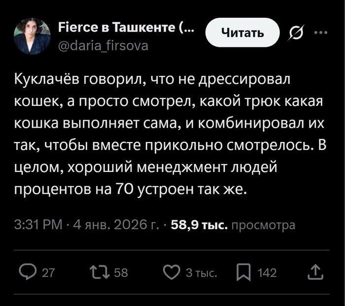 питомцев. Секрет дрессировки кошек от Юрия Куклачева и его семьи основан на глубокой любви, терпении и знании индивидуального характера кошки, используя гуманные методы и позитивное подкрепление вместо насилия. Он изучает особенности каждой кошки, выбирая любимые игры и лакомства, и отдает команды очень тихо, полагаясь на тонкий слух животных. Секрет — не в трюках, а в создании доверия и понимания, превращающем дрессировку в искусство. Так же и в отношениях. Вам нужен «кот» или «кошка», которые изначально хотят делать то, чего сами хотят и это желание у совпадает с вашим. К сожалению, многие пытаются передрессировать своих котов и кошек, вместо того, чтобы любить их такими как они есть. А вы как думаете?