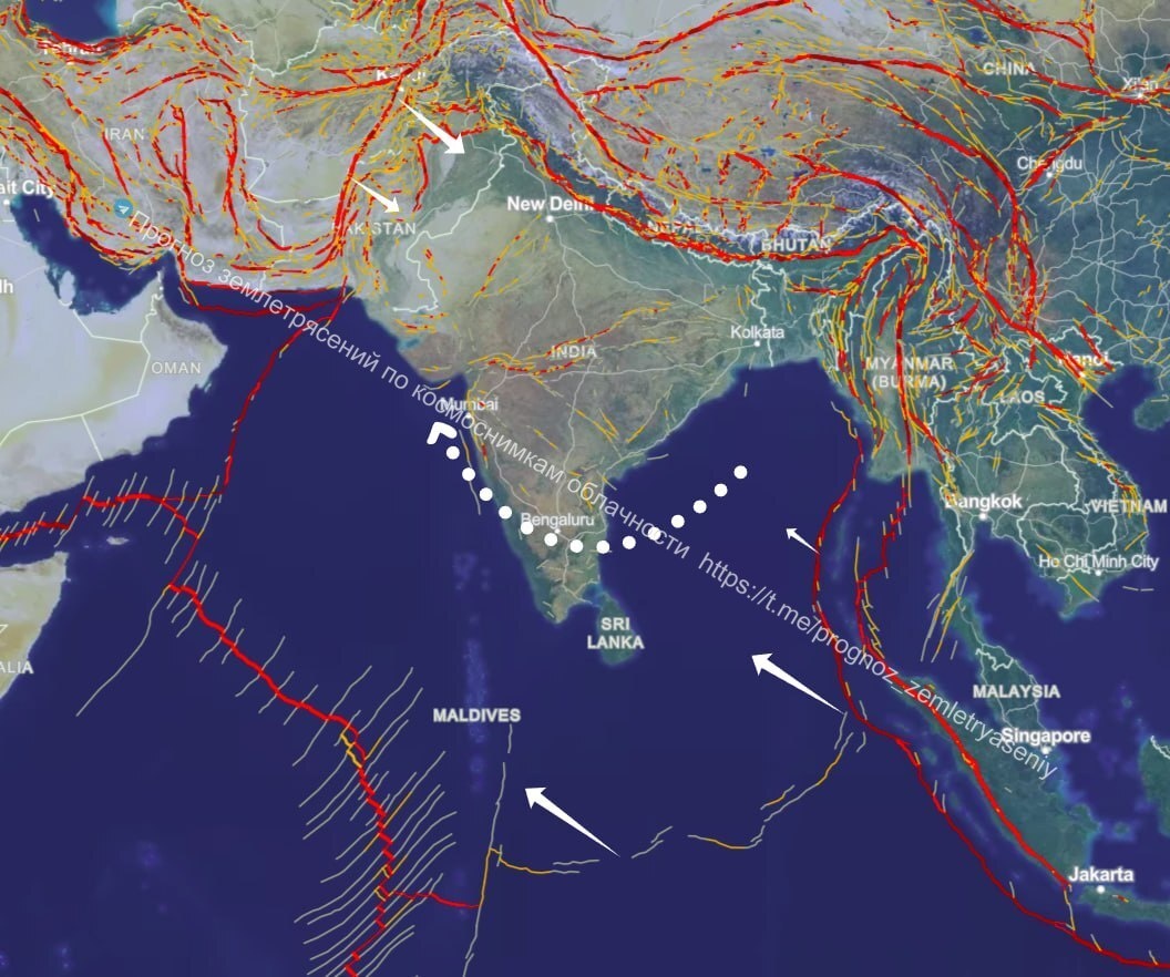 Наибольшее напряжение наблюдается от Мьянмы до Суматры и далее в сторону Мальдивских островов. Также дегазируется зона в районе Афганистана/Пакистана. ====== The Hindustan plate is in tectonic tension, which, judging by the displacement of the CSTI, is swaying clockwise. The greatest tension is observed from Myanmar to Sumatra and further towards the Maldives. The area around Afghanistan/Pakistan is also being degassed.