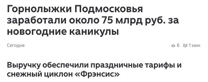 Но что-то математика не бьется Если взять средний чек 5000 руб, то за каникулы должно было быть 15 000 000 продаж В МО столько народа с лыжами и бордами нет, а то и по всей РФ. 7.5 млрд - может быть.