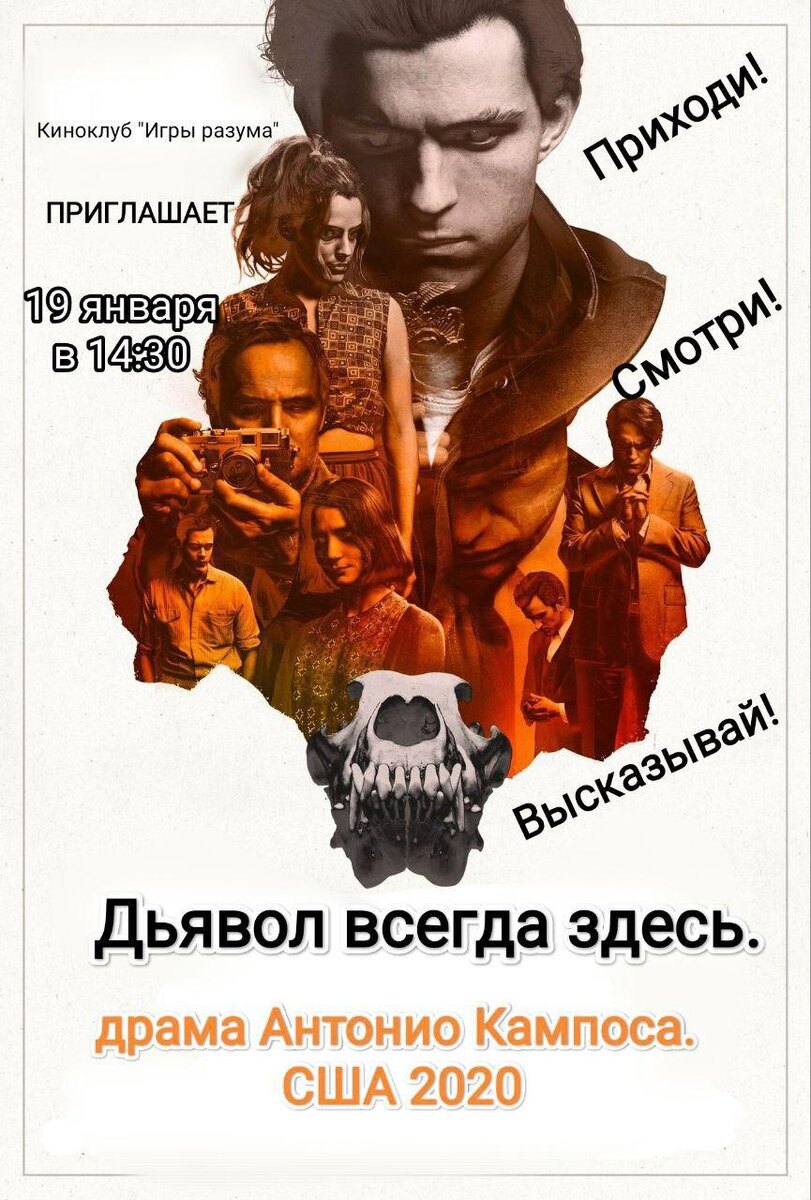 Р. Поллока "Дьявол всегда с нами". 🎥 Драма, срежиссированная Антонио Кампосом заставит задуматься о внутренних страхах, о сложности морального выбора при торжестве стереотипов. ⏰ Когда: 19 января в 14:30 🏛 Где: московский филиал СПбГУП, актовый зал. 🎟 Приглашаем всех, кто любит хорошее кино и хорошо поговорить! Приходи! Смотри! Высказывай! Сайт: msk-gup.ru/ ВК сообщество: vk.com/inisk ТГ канал: https://dzen.ru/id/6537d0070d3ed760fbd1986c #Зеленоград #СПбГУП #ИИиИТ #Институт #Университет #Химки #Клин #Солнечногорск #Куркино #Менделеево #Лунёво #Фирсановка #Андреевка #Голубое