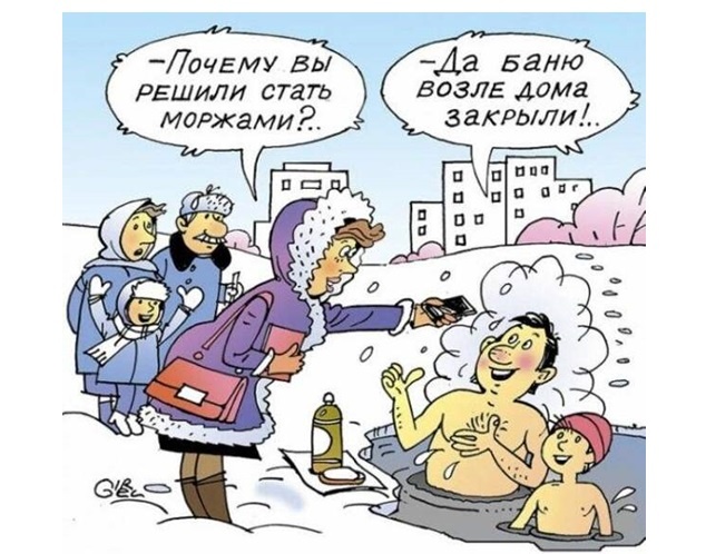 19 февраля отмечается православный праздник - Крещение. Помимо церковной службы и дня отдыха от домашних дел в него традиционно стараются запастись водой или искупаться. Самые отважные окунаются в прорубь, будто заядлые моржи. Что ж, давайте посмотрим, как карикатуристы отразили атмосферу народных купаний и закаливаний. Вас ждут 20 забавных иллюстраций. Приятного чтения) Люди делятся на два типа: мерзляки (я отношусь к ним), для которых закаливание подобного рода кажется настоящим экстримом, и приверженцы ЗОЖ, уверенные, что ледяная водичка грехи смоет и здоровья придаёт. Екатерина Мартинович отправила своих героев именно с этой целью - закаляться. Забавно, что второй мужчина так адаптировался, что может лепить снежных уточек. Игорь Кийко предложил совместить моржевание и зимнюю рыбалку. Вполне логично - и там и там приходится проводить время на льду. с той лишь разницей, что купальщики раздеты, а рыбаки укутаны по самые глаза. Сергей Белозёров в своём фирменном "пушистом стиле" создал