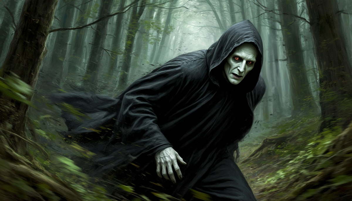Тревожный шелест доносится из глубины чащи – он не похож ни на шепоток листьев, ни на суетливую возню мелких зверьков. Ветви хрустят под чьей-то торопливой поступью, кусты вблизи цветочной поляны начинают трепетать. Пара землероек испуганно ныряет в свои норы, и спустя мгновение на поляну выскакивает человек. Выглядит он более чем пугающе и странно: высокий, худой, с совершенно белой кожей – он напоминает ожившего мертвеца. Плоский нос с ноздрями-щелками придает его лицу что-то змеиное. Красные, с узкими зрачками глаза распахнуты – в них застыл ужас. Одеянием странному человеку служит изодранная черная мантия – местами она опалена, кое-где потемнела от крови.