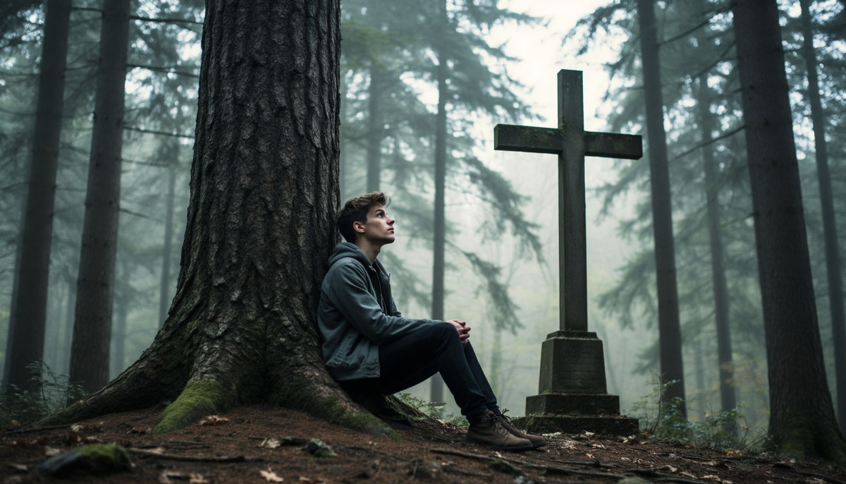 Останавливаюсь перед древним дубом. Его кора шершава и холодна, как кожа мертвеца. Рядом — простой деревянный крест. Я прикасаюсь ладонью к грубой, намокшей от сырости древесине. Она отдает в пальцы ледяным онемением.