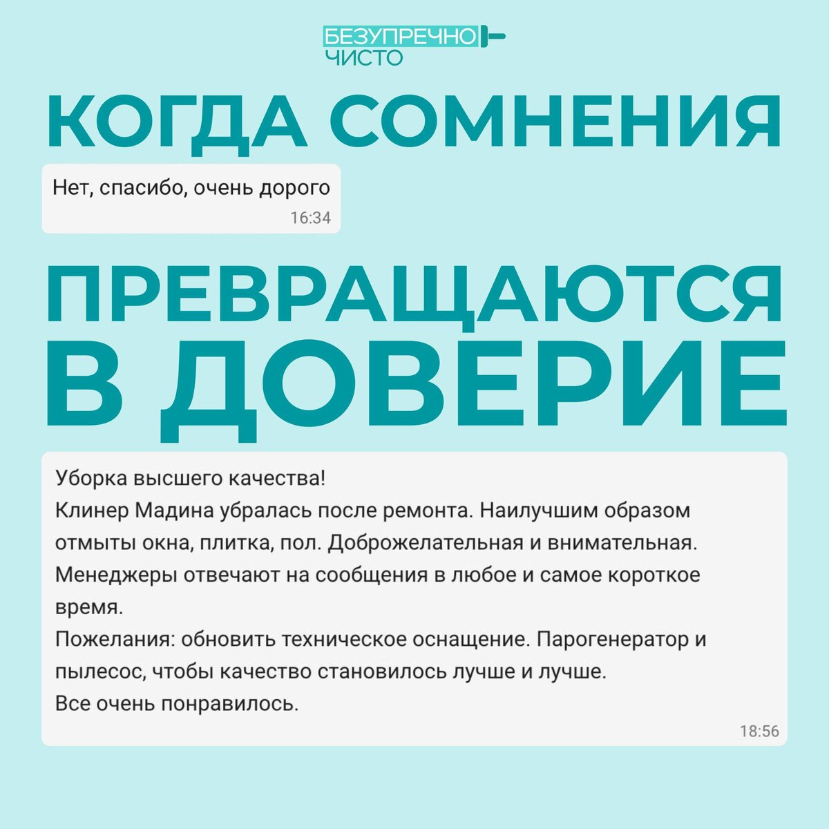 При расчёте стоимости уборки мы часто слышим привычные фразы: «Дорого», «Я подумаю». И мы прекрасно понимаем эти сомнения. 🔹Обращаться в новую клининговую компанию всегда волнительно, ведь хочется получить идеальный результат и не разочароваться. Именно поэтому мы с особым вниманием и бережным отношением подходим к каждому клиенту и каждому вопросу. 🔹Для нас важно выполнить не просто уборку, а оправдать доверие. Особенно приятно, когда такие истории заканчиваются положительными эмоциями: клиенты остаются довольны, а мы получаем тёплые отзывы с благодарностью. 🔹Те самые опасения, которые были в начале, полностью рассеиваются после уборки, потому что результат действительно радует. И довольно часто наши новые клиенты становятся постоянными. Для нас такие истории — лучшее подтверждение того, что мы выполняем свою работу Безупречно Чисто🔹 🔹Если вы тоже сомневаетесь — просто напишите нам @b_chisto. Мы с радостью ответим на все вопросы и покажем, что чистота может приятно удивлять�