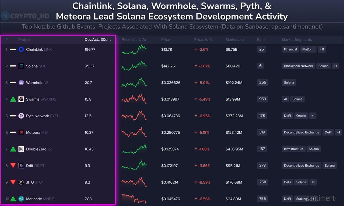 📊 Santiment: ТОП-10 криптопроектов экосистемы Solana по активности разработчиков за последние 30 дней. 1. ChainLink #LINK 2. Solana #SOL 3. Wormhole #W 4. Swarms #SWARMS 5. Pyth Network #PYTH 6. Meteora #MET 7. DoubleZero #2Z 8. Drift #DRIFT 9. JITO #JTO 10. Marinade #MNDE Ранее: прошлый топ Сryptо Headlines