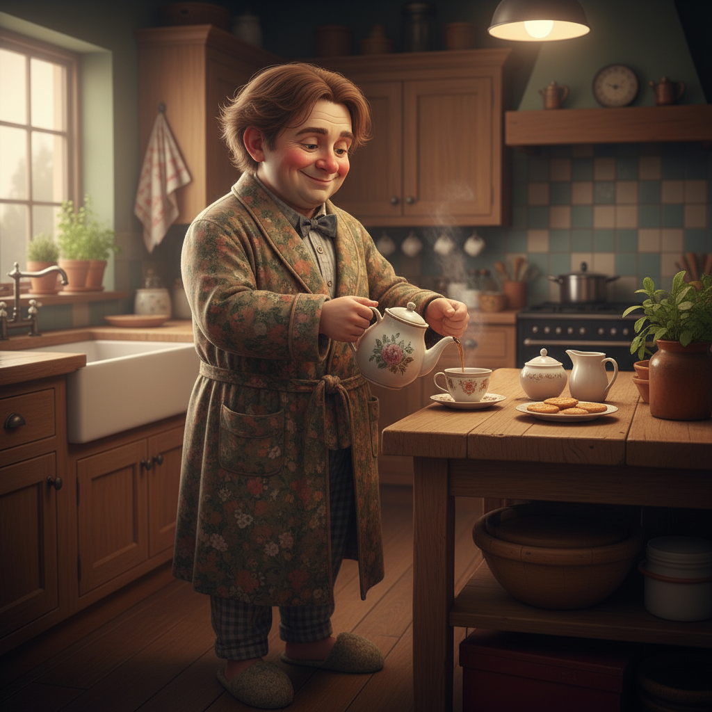 Затем Плюш переворачивался на бок, поджимал ноги, согнутые в коленях, к груди, зарывался в мягкое одеяло и так лежал, улыбаясь несколько минут. Потом он резко откидывал одеяло и вставал с возгласом: «Доброе утро всем!». Затем Плюш переходил к водным процедурам. Надо сказать, что этот человечек всегда, каждый день умывался только ледяной водой. При этом он фыркал так, что брызги летели далеко за пределы раковины. В этом они были очень схожи со Слюнявой Бульдожкой, с той лишь разницей, что она проделывала эту процедуру по нескольку раз в день.