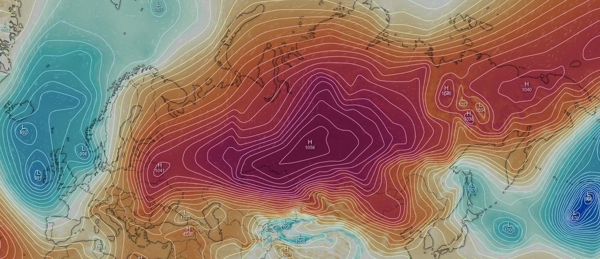 Так выглядит виновник морозов на территории России - барический "гигант" в лице масштабного сибирского антициклона на карте атмосферного