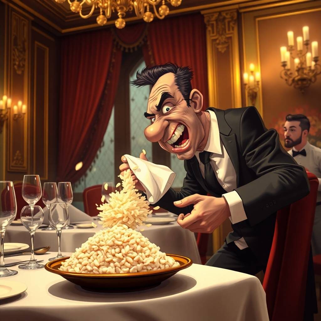 Жил-был гурман Егор, ценитель самой сути, самой эссенции. Услышал он о новом ресторане «У Посейдона». «Там, — шептались знатоки, — вы погрузитесь в саму стихию. Без посредников!». Егор, надев свою самую дорогую рубашку цвета морской волны, отправился на встречу с мечтой. Ресторан был выдержан в безупречной концепции: стены — как скалы, свет — как лунная дорожка, звучал шум прибоя. Официанты в тельняшках. В меню — сплошная поэзия: «Пена морская на подушке из водорослей», «Трепет парусов в соусе из бриза», «Вздох русалки, запечённый в фило». Егор, дрожа от восторга, заказал фирменное блюдо «Владыка морей». Он предвкушал плоть титана, соль на губах, мощь океана на одной тарелке. Через сорок минут ему торжественно принесли... идеально круглый, белый, паровой... рис. Ровно триста зерен, выложенных в виде трезубца. Рядом — три капли желе лимонного цвета. — Где же... владыка? — прошептал Егор.