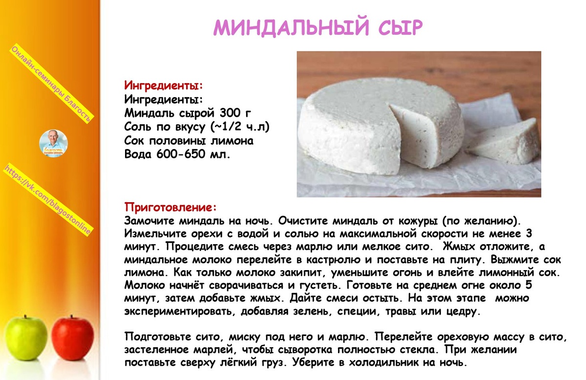 ⠀ 🌀 Ингредиенты: Миндаль сырой 300 г Соль по вкусу (~1/2 ч.л) Сок половины лимона Вода 600-650 мл. ⠀ 🌀 Приготовление: Замочите миндаль на ночь. Очистите миндаль от кожуры (по желанию). Измельчите орехи с водой и солью на максимальной скорости не менее 3 минут. Процедите смесь через марлю или мелкое сито. Жмых отложите, а миндальное молоко перелейте в кастрюлю и поставьте на плиту. Выжмите сок лимона. Как только молоко закипит, уменьшите огонь и влейте лимонный сок. Молоко начнёт сворачиваться и густеть. Готовьте на среднем огне около 5 минут, затем добавьте жмых. Дайте смеси остыть. На этом этапе можно экспериментировать, добавляя зелень, специи, травы или цедру. Подготовьте сито, миску под него и марлю. Перелейте ореховую массу в сито, застеленное марлей, чтобы сыворотка полностью стекла. При желании поставьте сверху лёгкий груз. Уберите в холодильник на ночь.