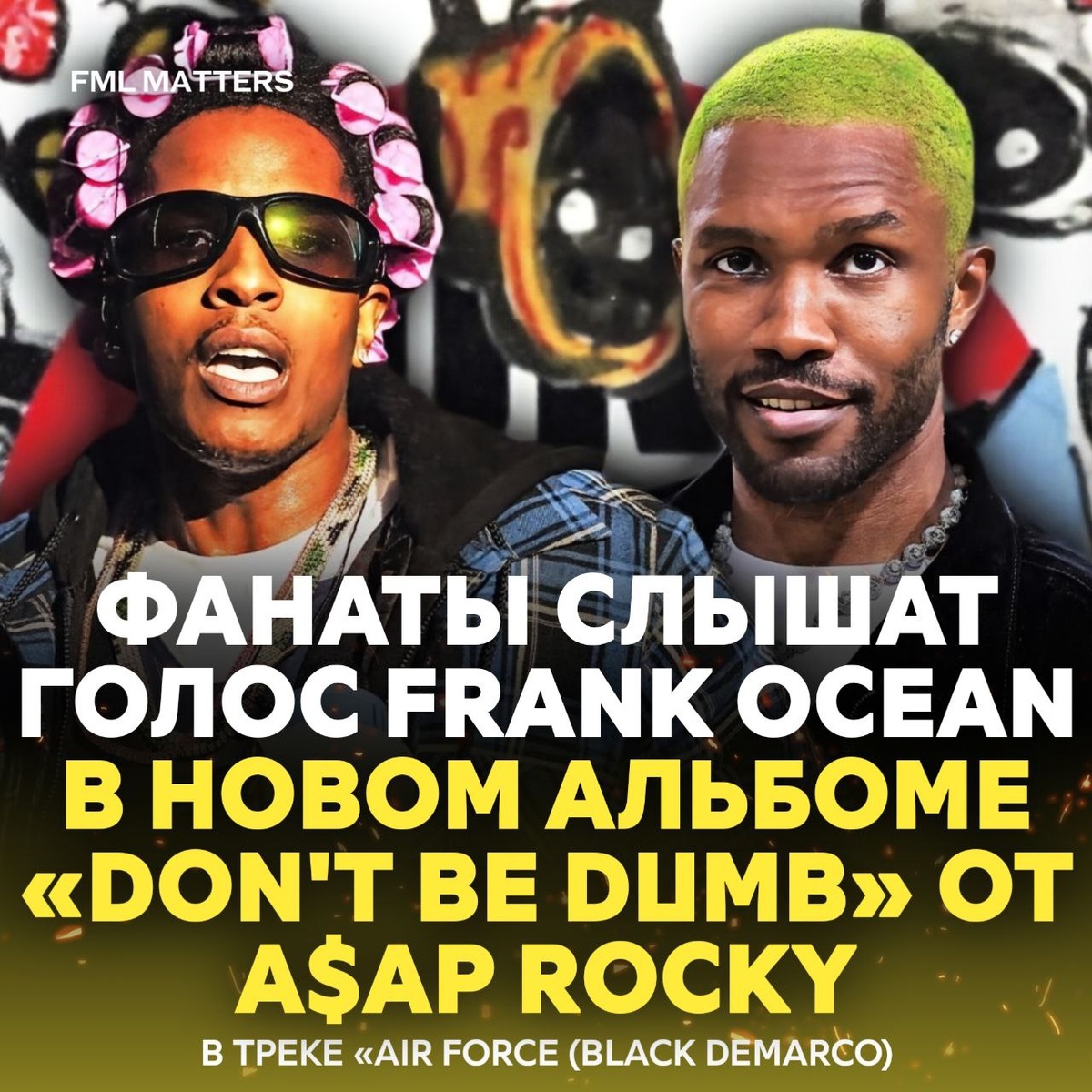 🤨 ФАНАТЫ СЛЫШАТ ГОЛОС FRANK OCEAN В НОВОМ АЛЬБОМЕ A$AP ROCKY! После релиза альбома «Don’t Be Dumb» фанаты активно обсуждают трек «AIR FORCE (BLACK DEMARCO)» — многие уверены, что на бэк-вокале звучит Фрэнк Оушен. ❤️🔥 — Это 100% он 👎 — Просто шизики 💀 FML MATTERS