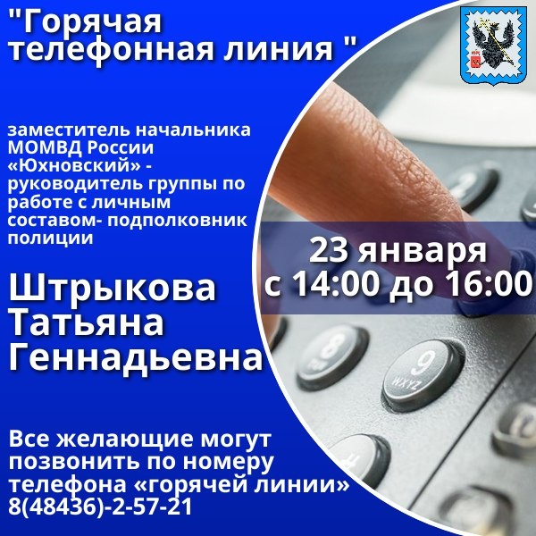 📞23 января с 14:00 до 16:00 в МОМВД России «Юхновский» будет проведена «горячая телефонная линия» с заместителем начальника МОМВД России