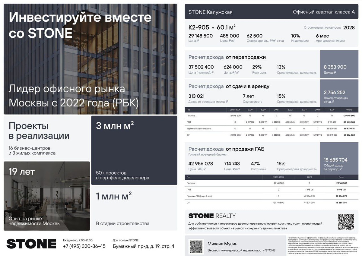 Формат новый и интересный. Задача это сложная - сделать расчеты с одной стороны профессиональными, а с другой понятными большой, в том числе неподготовленной, аудитории. За подход к этому снаряду коллегам из STONE однозначно лайк. ⚠️ Важно заметить, я анализирую только презентацию и то, как это выглядит, но не сами цифры. 👍 Что хорошо у STONE. Визуально лаконичная презентация с крупными цифрами предпосылок, акцентами на ключевых показателях, есть таблица с денежным потоком по годам. Выглядит профессионально и презентабельно. В принципе, достигается эффект быстрого восприятия ключевых цифр, структура в целом понятна и для тех, кто не любит копаться в таблицах. Осознать основные параметры сделки можно и это хорошо для первого знакомства с инвестиционной идеей. 🤨 Что не совсем хорошо! Непонятно, что такое среднегодовая доходность и как она посчитана. Это IRR или нет? В презентации присутствуют термины, понятные финансовым аналитикам, но не очень понятные широким народным массам - тер