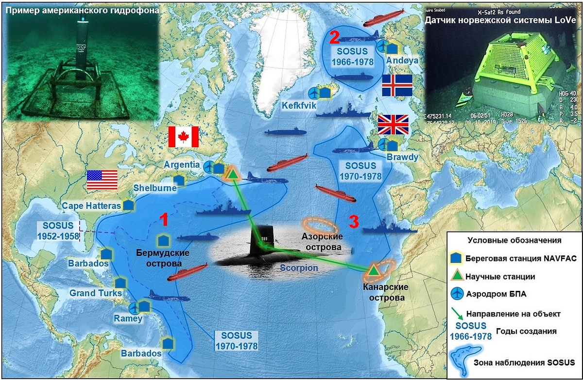 Зелёными стрелками обозначено, как с её помощью было определено место гибели подлодки США "Скорпион" по звукам разрушения её корпуса. Аналогичные приборы в Тихом океане позволили американцам засечь момент гибели нашей К-129, а потом, уточнив координаты - попытаться её поднять для изучения. Конечно, эта система действовала в кооперации с кораблями и авиацией ПЛО.