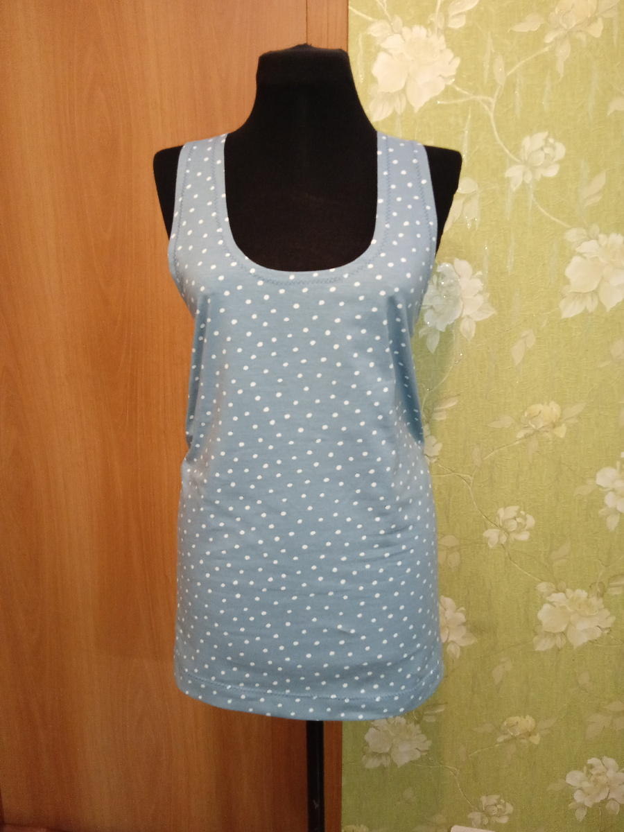 После раскроя брюк из кулирки остается длинный выпад, который идеально походит для простой майки. Выпад разный по ширине, поэтому боковой шов майки сместила на спинку, чтобы передняя часть майки была со свободой на груди. Стачала боковые и плечевые швы. Швы плечевые отогнула на спинку и настрочила зигзагом. Боковые швы настрочила на переднюю часть майки. Осноровила, то есть углубила пройму по полочке. Низ майки тоже осноровила. Горловину, пройму и низ обработала простой подгибкой, большим зигзагом. Майка готова. Спинка закрытая, бретели широкие, хорошо смотрится на широкоплечих девушках. Надеюсь, что статья была вам полезна. Больше шитья смотрите в тематических подборках на моем канале "Клуб домохозяек на Дзене". Подписывайтесь на канал. Добро пожаловать.