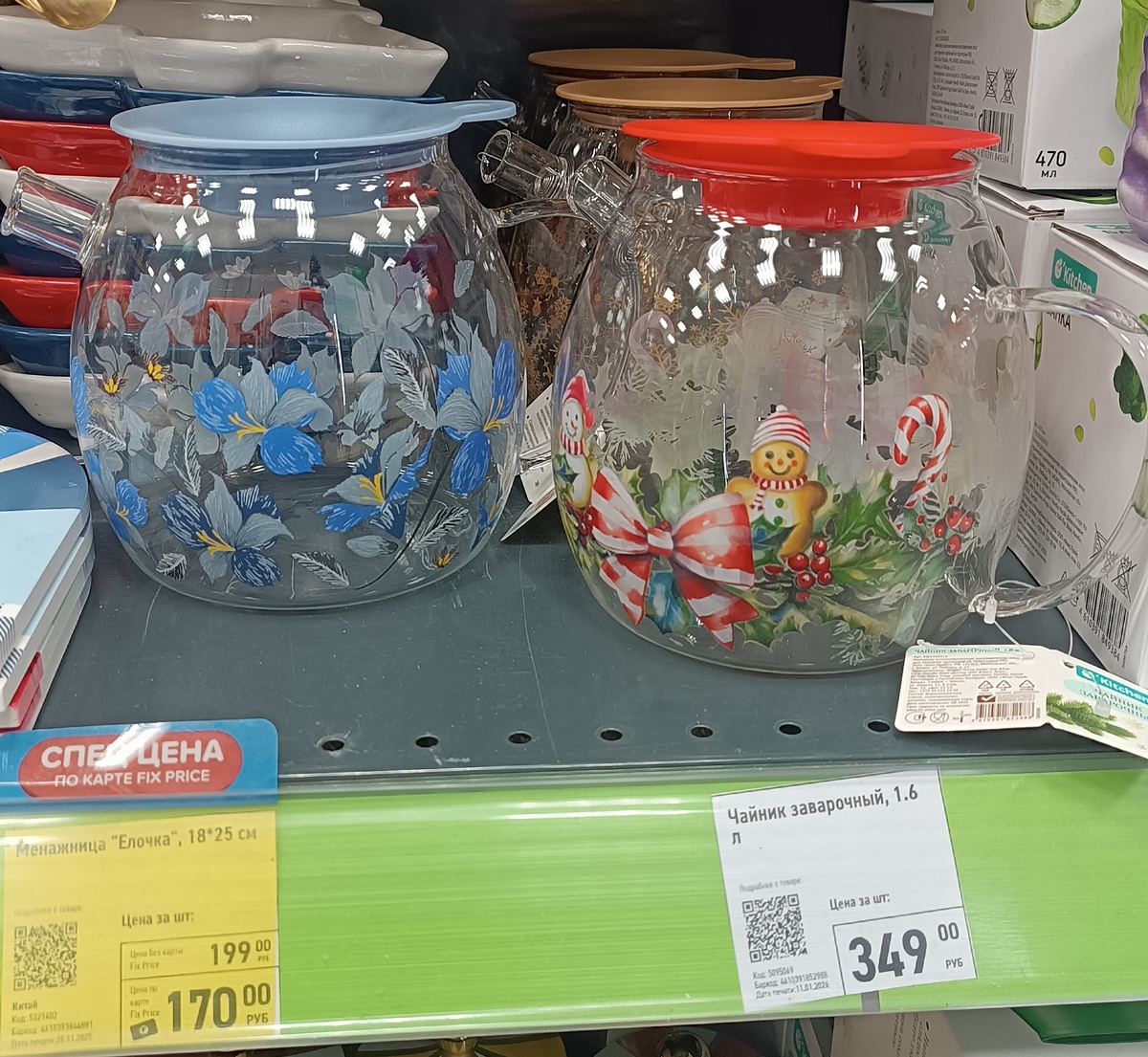 Зашла и сразу в глаза мне бросились эти красивые заварочные чайники. И с новогодним орнаментом и уже с весенне- летним. Красивые то они красивые, но обращаться с ними нужно аккуратно, очень уж они легко бьются.
