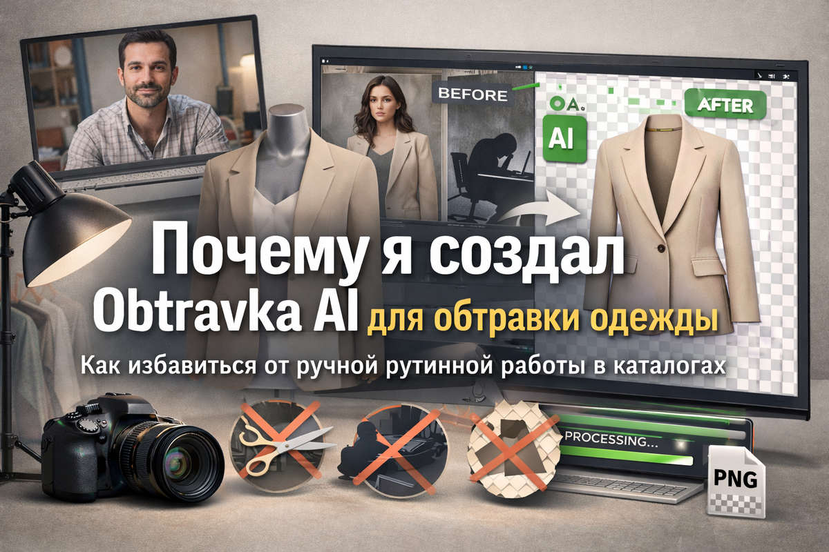 Я работал с продавцами одежды и видел один и тот же сценарий: И самое обидное — это не про креатив. Это чистая операционка, которая съедает время команды и тормозит продажи. Ручная обтравка фото одежды выглядит “норм”, пока у вас 20–30 товаров. Но когда ассортимент растёт, всплывают реальные потери: Я понял: если мы хотим масштабироваться, нужен инструмент, который делает стабильно, быстро и одинаково. Я взял самую частую задачу в fashion e-commerce — обтравку одежды — и поставил себе простую цель: Пользователь загружает фото одежды на модели/манекене → через минуту получает PNG с прозрачным фоном, готовый для каталога. Без ТЗ на 2 страницы. Без “ой, я случайно съел край воротника”. Без переписок. Так появился Obtravka AI — сервис, который автоматически: Если вы регулярно делаете обработку фото для интернет-магазина одежды или вам нужна подготовка фото для маркетплейса, то ключевой выигрыш — не “вау-эффект”, а экономика процесса. Obtravka AI помогает: Мини-кейс из реальности (по тип