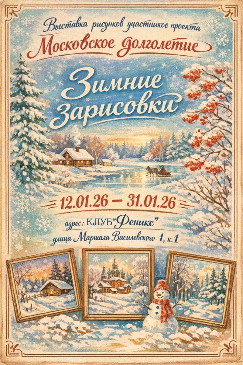 ❄ Дорогие друзья, мы вновь приглашаем вас на выставку рисунков участников проекта «Московское долголетие», посвящённую самому волшебному времени года — зиме ❄ Зима вдохновляет по-особенному: первый пушистый снег, алые гроздья рябины, морозные узоры на окнах, тихие улочки, заснеженные домики и леса, укрытые белым покрывалом. В работах художников оживают тёплые воспоминания, новогоднее настроение и искренняя любовь к природе 🤍 Каждая картина — это маленькое путешествие во времени и пространстве. Большинство работ выполнены в реалистичном стиле и наполнены светом, спокойствием и душевным теплом. ✨ Яркие эмоции, хорошее настроение и незабываемые впечатления ждут всех гостей нашей выставки! 📅 12.01.26 – 31.01.26 📍 Клуб «Феникс» «Восток» улица Маршала Василевского, 1, к.1 🤍 Будем рады видеть вас и разделить зимнее вдохновение вместе #ЗимниеЗарисовки #МосковскоеДолголетие #ВыставкаРисунков #ЗимняяВыставка #ИскусствоДляДуши #ТворчествоБезВозрастныхГраниц #КлубФеникс #ЗимнееНастроен