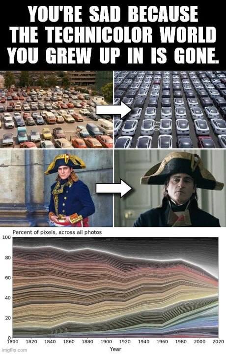 Окружающий нас мир с годами становится все более серым Американские имиджборды шутят на тему взаимосвязи настроения людей и окружающей их действительности. В общем-то, каждый из нас заметил, что в бытовом смысле цветов вокруг стало меньше: у всех бежевые кухни, однотонная одежда, да даже игрушки детские стали не такими яркими (привет "бежевым мамам"). Насколько цветовая деградация реально влияет на наш мозг - вопрос для экспертов. А вот мне стало интересно, что за график используется в меме. Оригинал изображения находится в публикации некой Кэт Слиман (исследование датируется 2020 годом). Суть в том, что ученые взяли 7 тысяч фотографий предметов из коллекции музея науки и проанализировали их цвета. Занятное исследование получилось. Рекомендую. И купите что-нибудь яркое себе домой, так, на всякий случай.